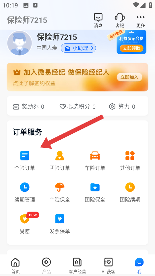 2、進(jìn)入我的賬號(hào)頁(yè)面,在訂單服務(wù)的板塊中,我們需要點(diǎn)擊個(gè)險(xiǎn)訂單,來(lái)查看個(gè)人險(xiǎn)訂單詳情。