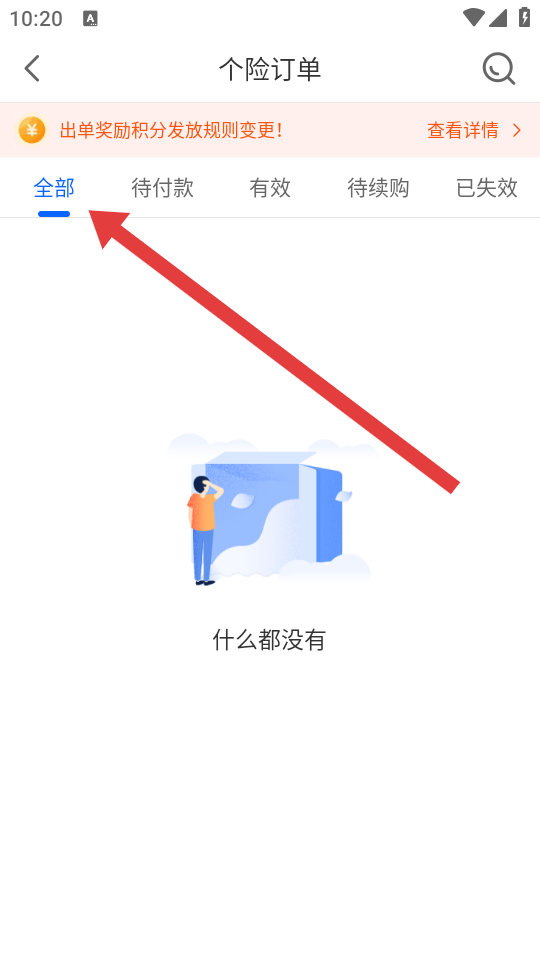 3、進(jìn)入個(gè)險(xiǎn)訂單頁(yè)面,點(diǎn)擊全部的標(biāo)簽,可以查看所有個(gè)險(xiǎn)訂單狀態(tài)含待付款、有效等分類。