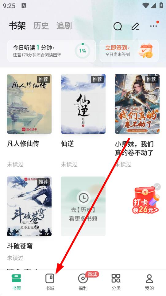 1、打開(kāi)書(shū)旗小說(shuō)APP,點(diǎn)擊底部導(dǎo)航欄中的書(shū)城,進(jìn)入書(shū)城界面,這里有各種小說(shuō)資源可供選擇。