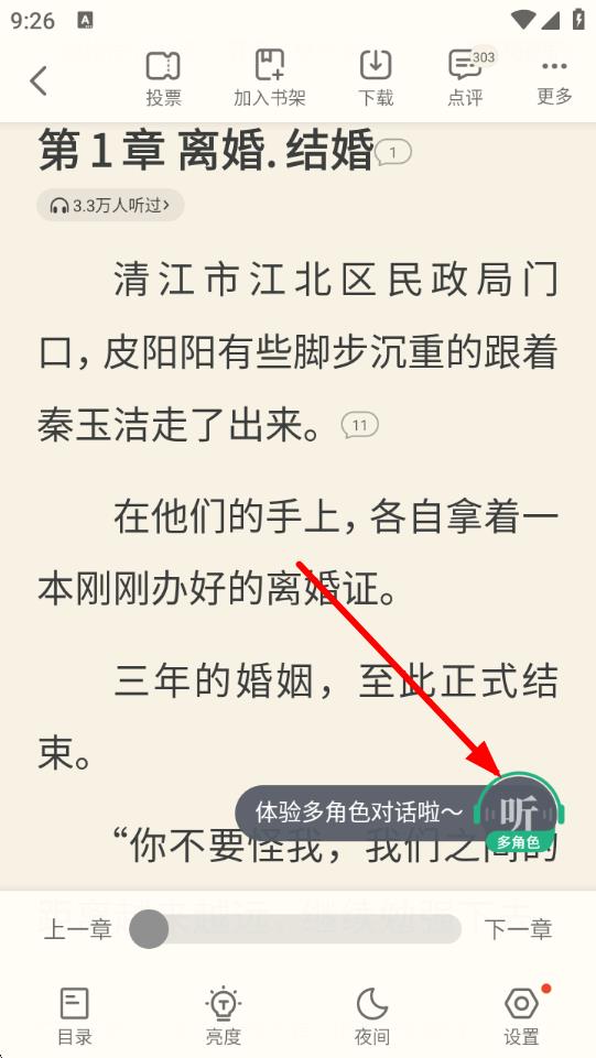 3、在小說(shuō)閱讀頁(yè)面,點(diǎn)擊屏幕右下角帶有聽(tīng)字的圓形按鈕,即可開(kāi)始收聽(tīng)該小說(shuō),享受多角色聽(tīng)書(shū)體驗(yàn)。