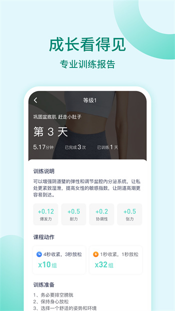這是一款提供盆底肌鍛煉指導(dǎo)的專業(yè)健身app,針對盆底肌的專業(yè)訓(xùn)練課程,幫助用戶更好地控制肌肉群,現(xiàn)在可通過凱格爾訓(xùn)練來清楚了解訓(xùn)練方式,有動作精細(xì)分解的講解,自己在家也可以學(xué)習(xí)鍛煉啦!