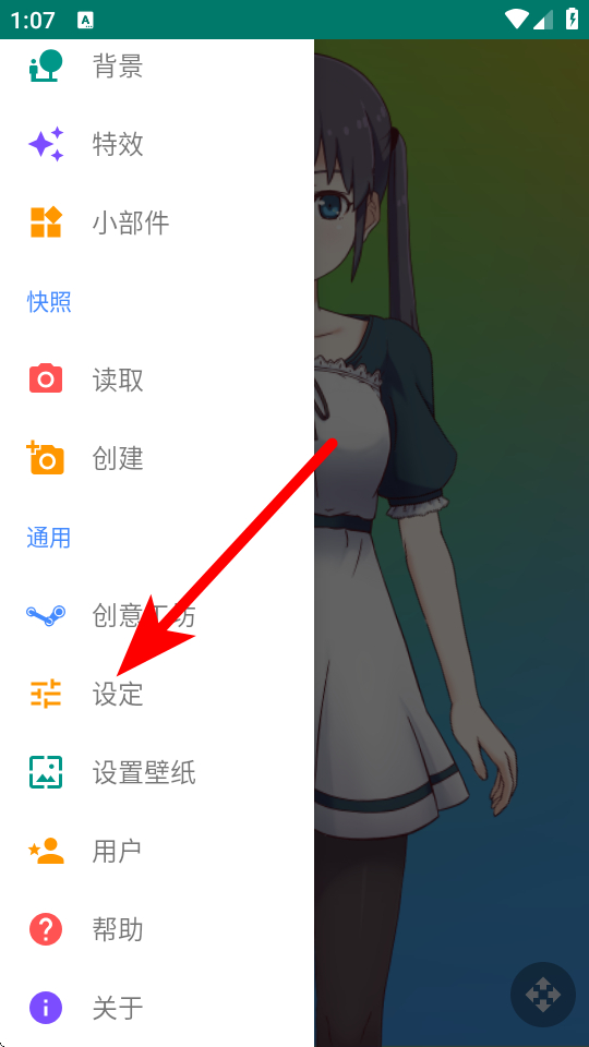 2、在側(cè)邊菜單里,向下滑動(dòng)找到并點(diǎn)擊設(shè)定選項(xiàng),進(jìn)入設(shè)置頁(yè)面。