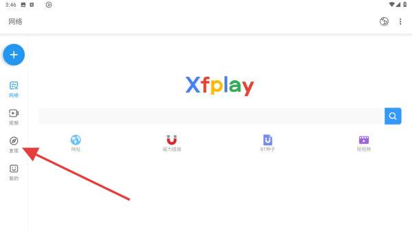 1、打開(kāi)影音先鋒App,在左側(cè)菜單欄點(diǎn)擊發(fā)現(xiàn)的圖標(biāo)選項(xiàng)。