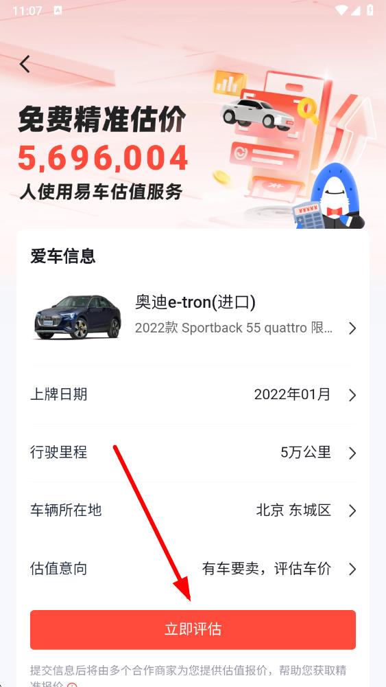 5、選擇好品牌車型后,完善上牌日期、行駛里程、車輛所在地等愛車信息,最后點擊立即評估按鈕,獲取車輛估值。