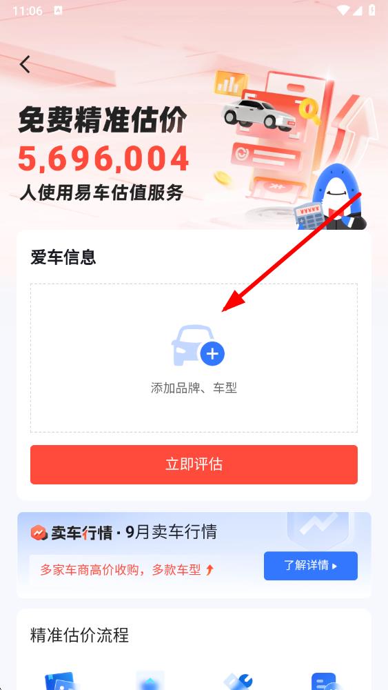 3、進入愛車估值界面后,點擊添加品牌、車型區(qū)域,開始錄入車輛信息。