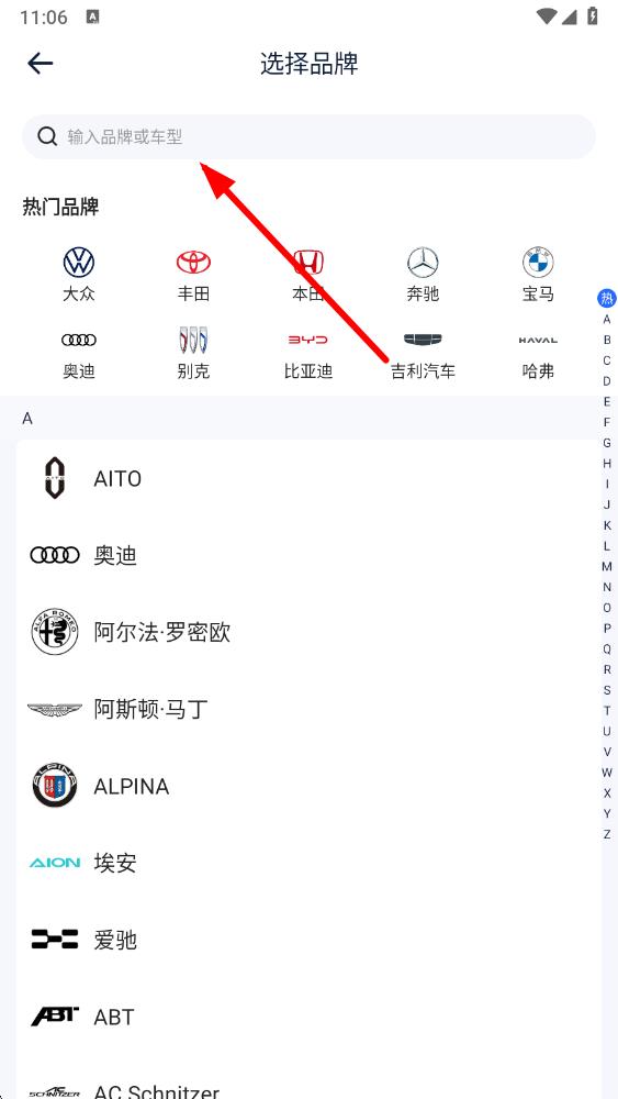 4、在選擇品牌頁面,可通過搜索欄輸入品牌或車型,也可直接在熱門品牌列表中選擇愛車品牌。
