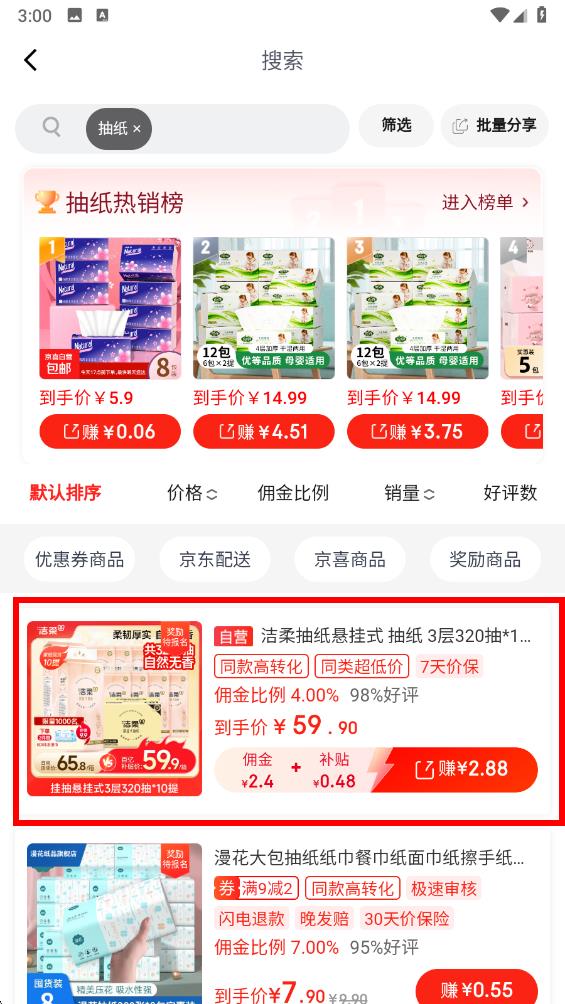 1、打開京粉app,在首頁(yè)的搜索欄中輸入想要推廣的商品關(guān)鍵詞,比如抽紙,點(diǎn)擊搜索,瀏覽搜索結(jié)果,找到想要推廣的商品。
