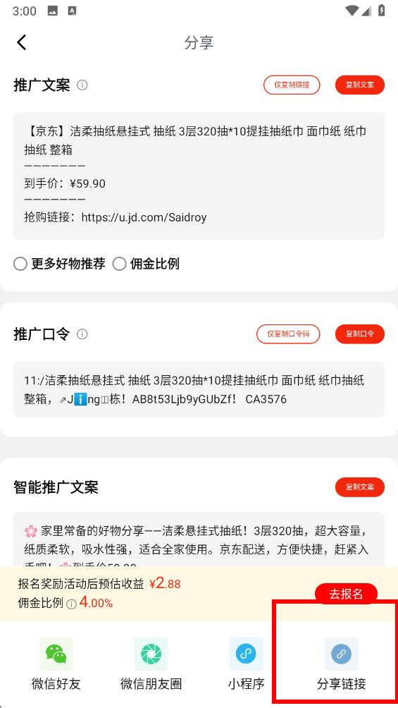3、在商品詳情頁(yè)面,點(diǎn)擊分享按鈕,選擇分享鏈接等分享方式,將商品推廣鏈接分享給他人,當(dāng)他人通過您分享的鏈接購(gòu)買商品后,您即可賺取相應(yīng)的傭金。
