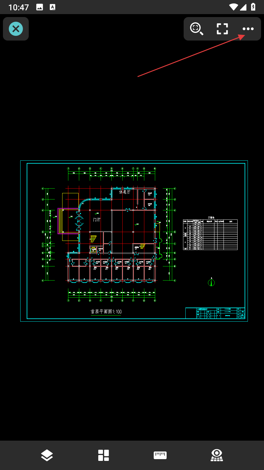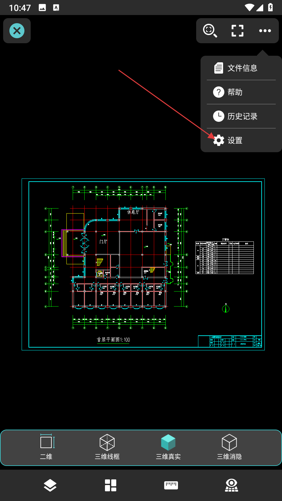 2、在圖紙查看界面,點擊右上角的三點圖標,彈出包含文件信息,設(shè)置等選項的菜單。
