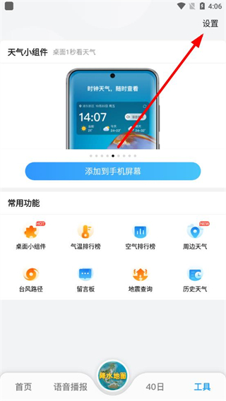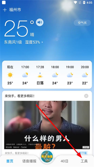 1、在15日天氣預(yù)報(bào)app界面點(diǎn)擊工具選項(xiàng),進(jìn)入工具頁(yè)面。