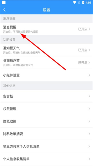 3、在設(shè)置頁(yè)面點(diǎn)擊消息提醒選項(xiàng),進(jìn)入消息提醒頁(yè)面。