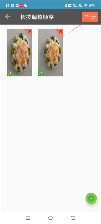 4、在這里就會(huì)看到自己選中的圖片,長(zhǎng)按圖片可以拖動(dòng)自己圖片的位置順序,點(diǎn)擊右下角的加號(hào)可以增加自己制作的圖片,之后再次點(diǎn)擊右上角的【下一步】;