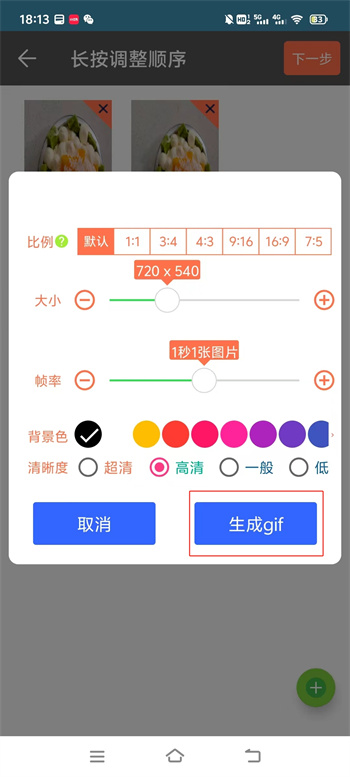 5、在這里為自己選擇點(diǎn)擊比例、大小、幀率、背景色、清晰度,制作出自己想要的gif最終效果,設(shè)置完成之后就可以點(diǎn)擊【生成gif】;