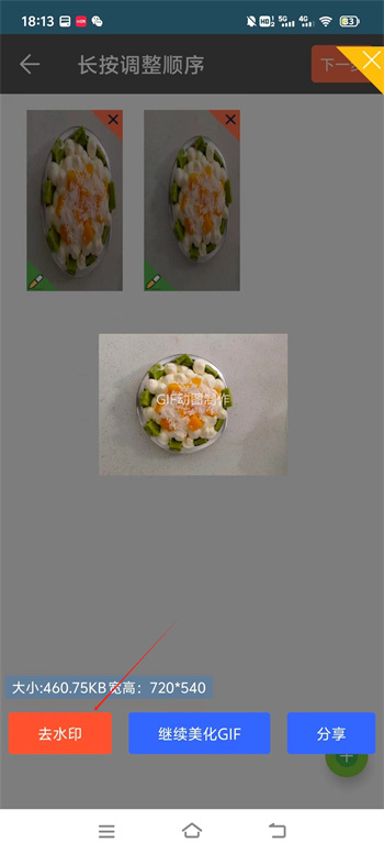 6、這時(shí)候照片的gif就會(huì)成功生成出來(lái),這時(shí)候的照片上面還有水印,只需點(diǎn)擊左下角的【去水印】就可以制作出一個(gè)去除水印的gif效果。