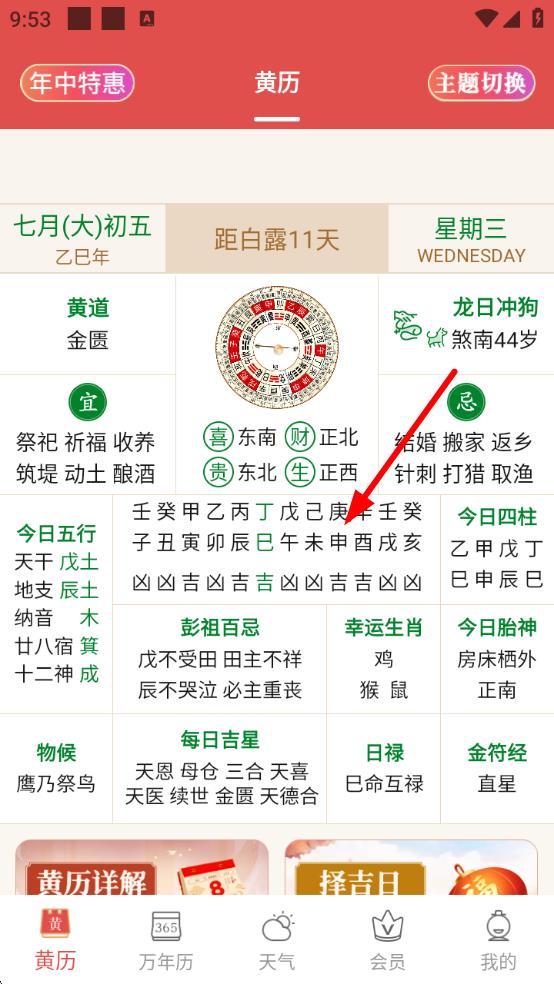 2、在黃歷主界面中,瀏覽當(dāng)日黃歷信息,找到并點(diǎn)擊相關(guān)的吉時(shí)查詢?nèi)肟冢赡茉诹_盤圖標(biāo)附近或下方功能區(qū)。