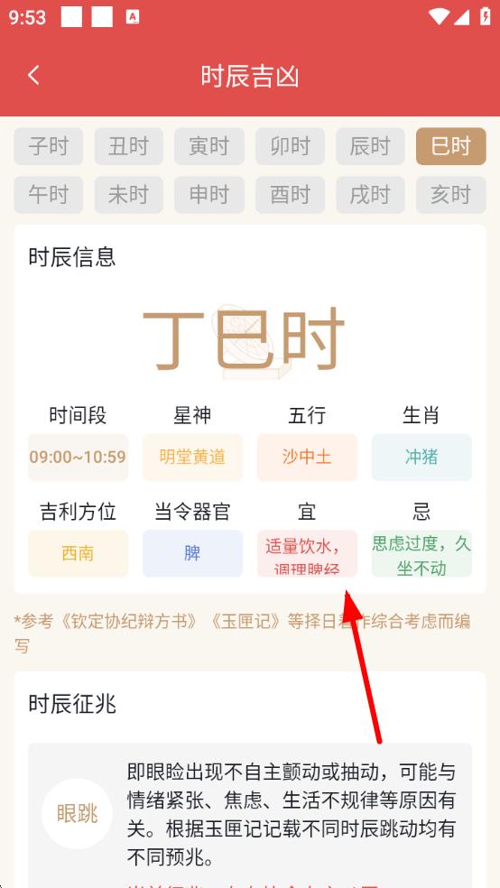 3、進(jìn)入時(shí)辰吉兇頁面后,查看各個(gè)時(shí)辰對(duì)應(yīng)的星神、五行、宜忌等信息,以此判斷吉時(shí)。