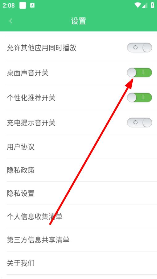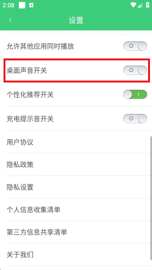 3、在設置界面里找到桌面聲音開關(guān)選項,其右側(cè)有開關(guān)按鈕。