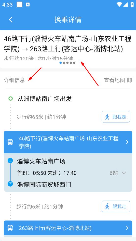 3、在換乘詳情頁,查看詳細(xì)信息,包含步行距離、公交首末班車時(shí)間等,按指引完成出行。