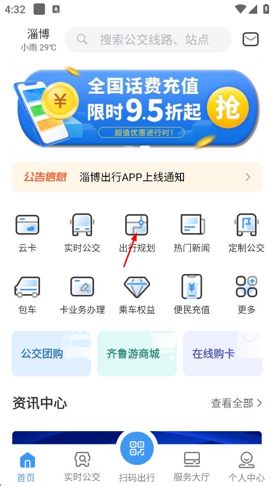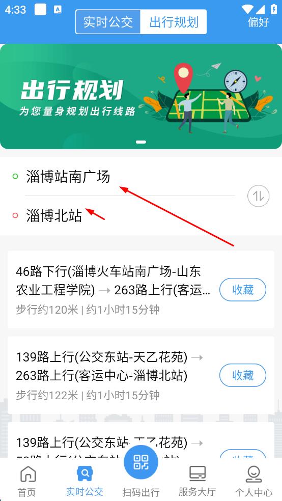 1、打開淄博出行APP,在首頁點(diǎn)擊“出行規(guī)劃”,進(jìn)入規(guī)劃頁面,選擇出發(fā)地“淄博站南廣場”與目的地“淄博北站”。