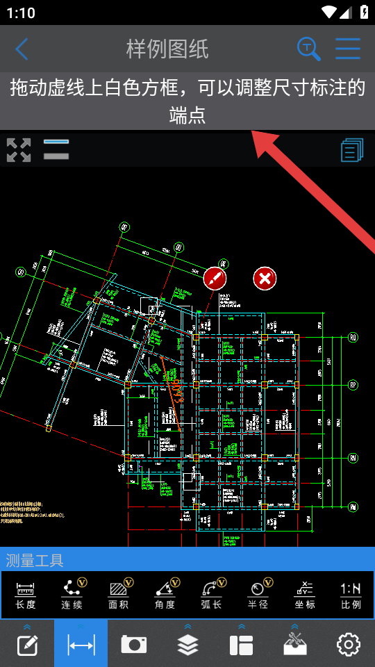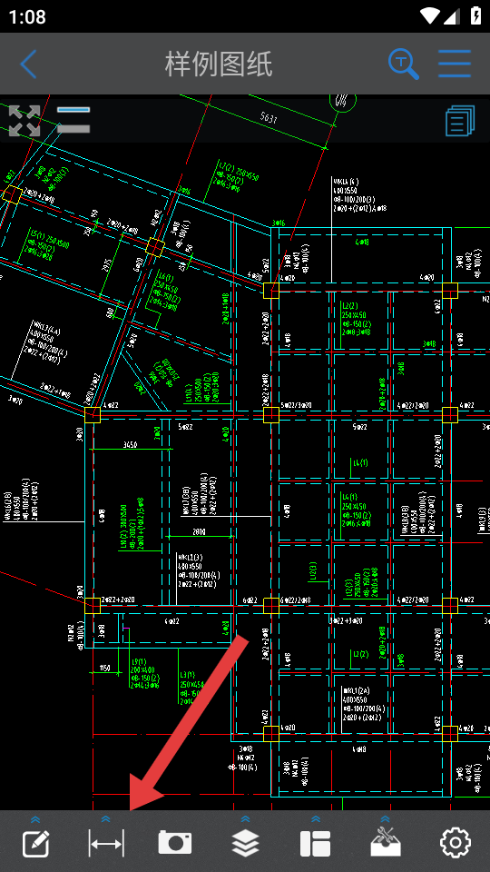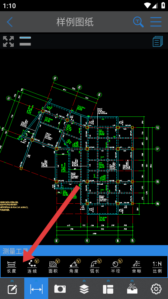 1、打開(kāi)CAD快速看圖APP,進(jìn)入圖紙查看頁(yè)面,點(diǎn)擊底部工具欄中的雙向箭頭圖標(biāo),喚起測(cè)量工具面板。