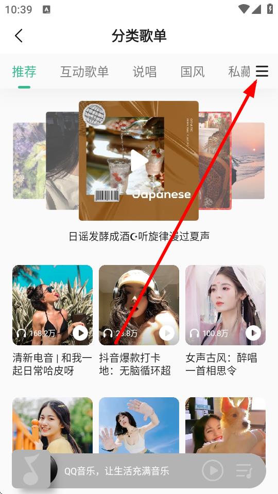 3、進(jìn)入分類歌單頁面后,能看到推薦的各類歌單,若想查看更多分類,點(diǎn)擊右上角的三橫線圖標(biāo)。
