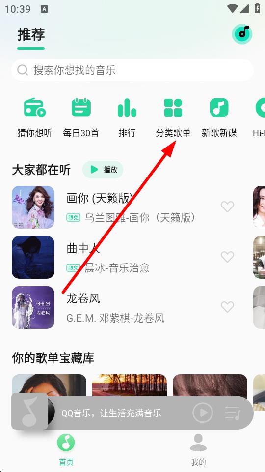 2、在首頁界面中,找到并點(diǎn)擊分類歌單選項(xiàng)。
