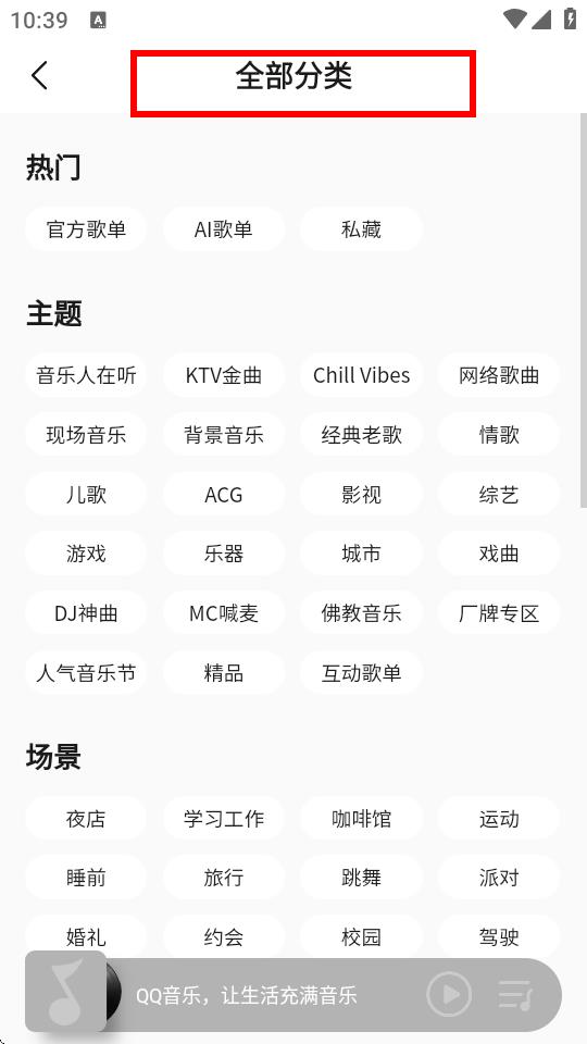 4、點(diǎn)擊后會(huì)進(jìn)入全部分類界面,在這里可以按照熱門、主題、場(chǎng)景等不同類別,查看豐富多樣的分類歌單。