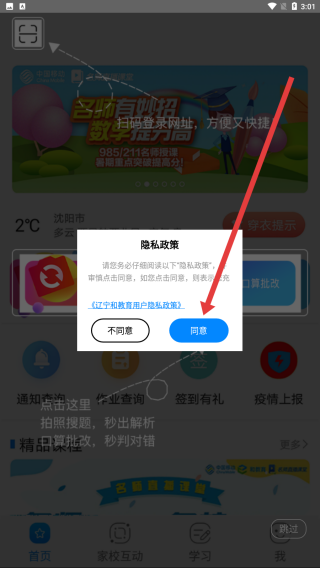 1、在應用彈出的隱私政策彈窗中,點擊同意按鈕,確認《遼寧教育官方隱私政策》,進入應用主界面開啟功能使用流程。