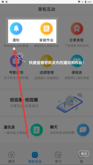 2、進入家?;咏缑婧螅c擊通知圖標,及時掌握學校發(fā)布的消息,跟進孩子學業(yè)相關的通知內容。