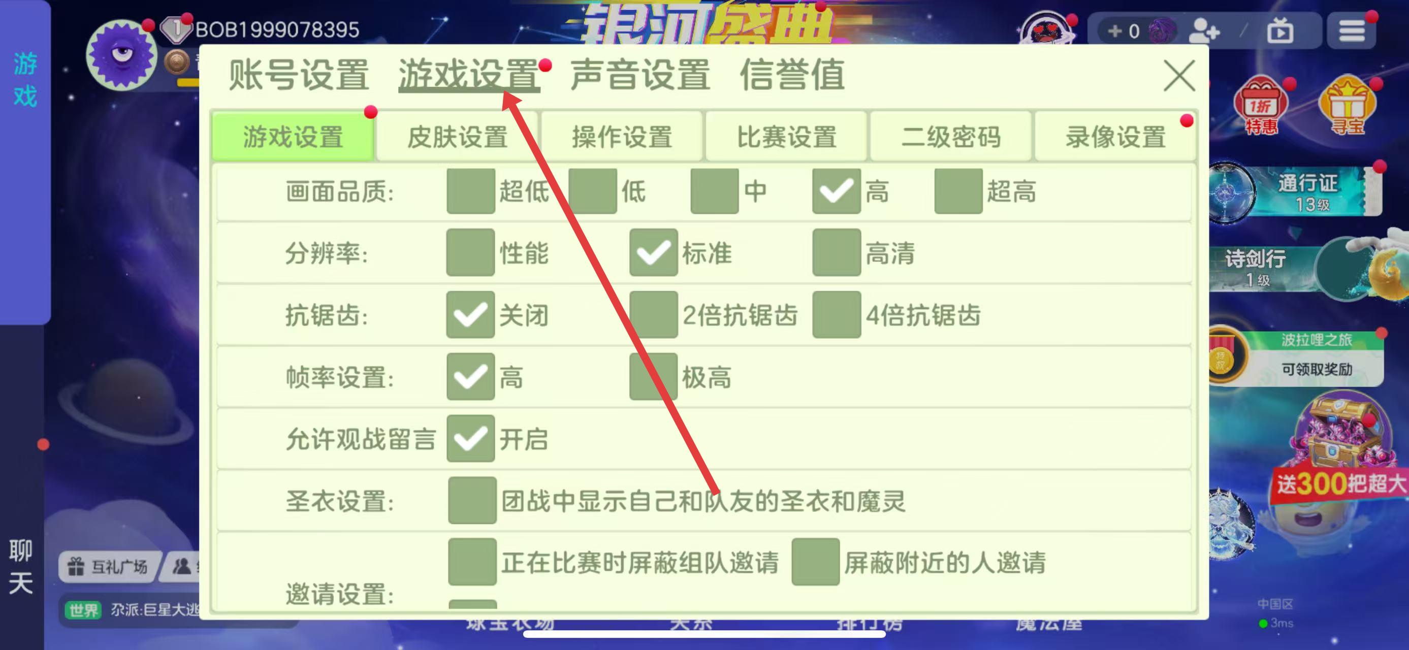 2、在彈出的設(shè)置窗口,選擇上方游戲設(shè)置標(biāo)簽,進(jìn)入后能設(shè)置畫面品質(zhì)、分辨率、抗鋸齒等游戲參數(shù),優(yōu)化游戲體驗(yàn)。