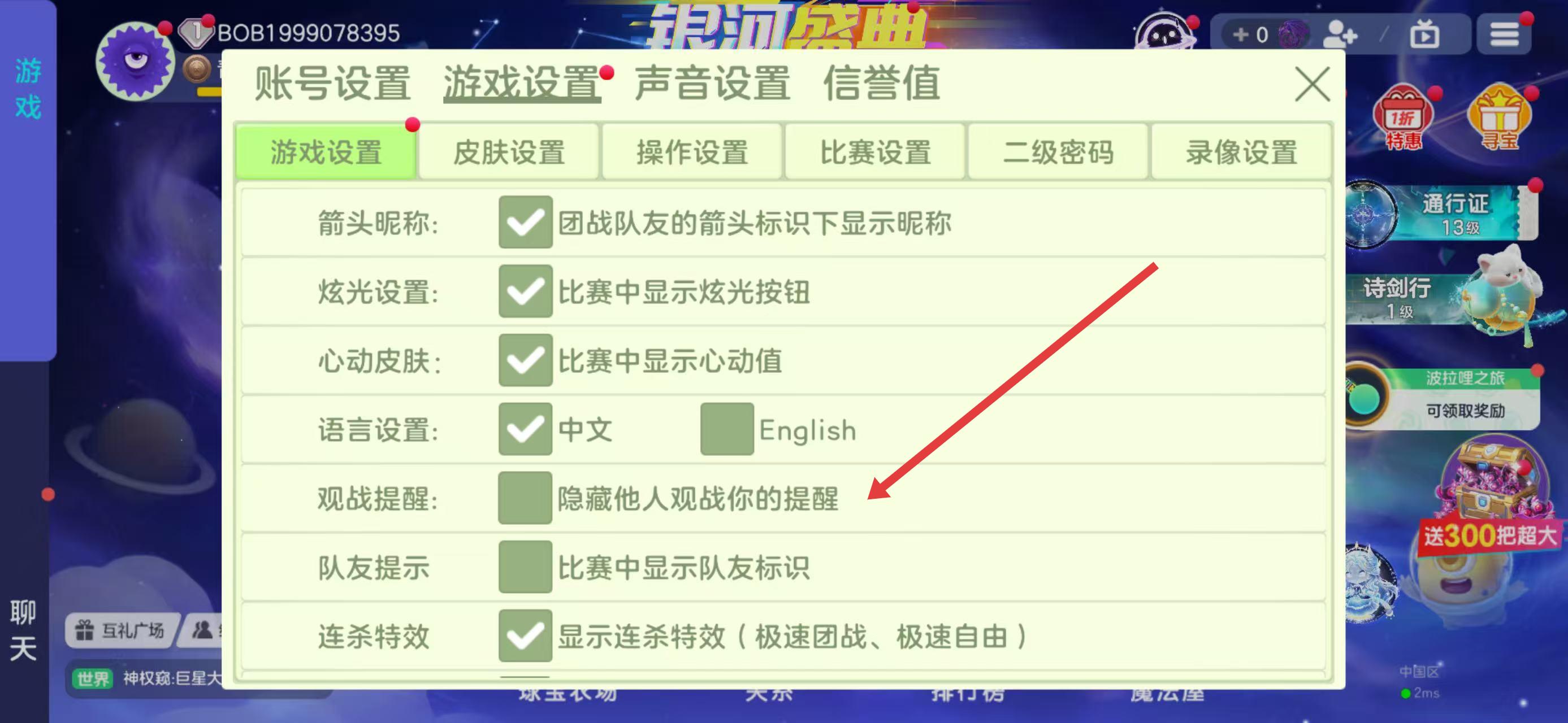 3、于游戲設(shè)置界面下滑,找到觀戰(zhàn)提醒選項(xiàng),勾選或取消隱藏他人觀戰(zhàn)你的提醒,控制是否允許他人觀戰(zhàn)自己游戲。