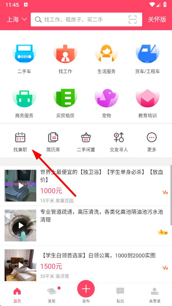 1、打開百姓網(wǎng)app,在首頁中找到并點(diǎn)擊找兼職選項(xiàng),進(jìn)入兼職信息頁面。