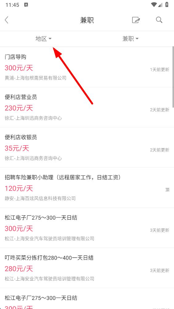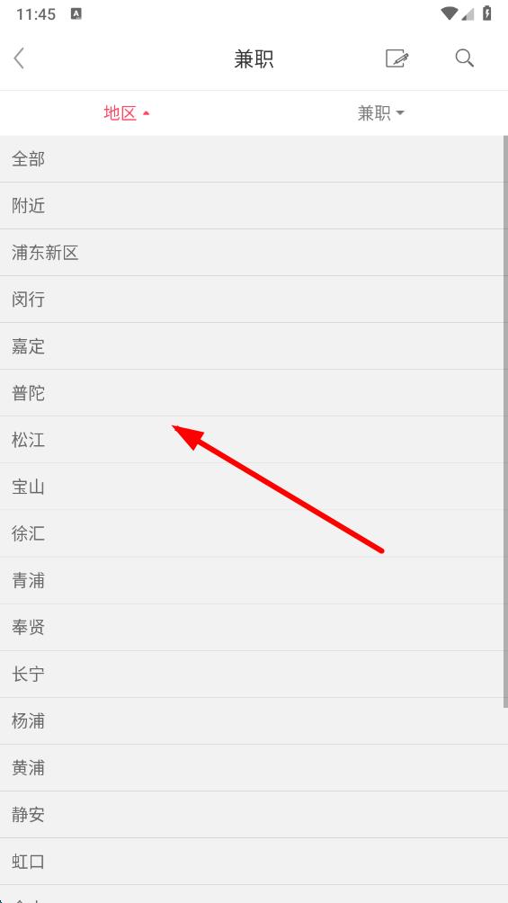 2、在兼職信息頁面,點(diǎn)擊地區(qū)選項(xiàng),篩選想要找兼職的地區(qū)范圍。
