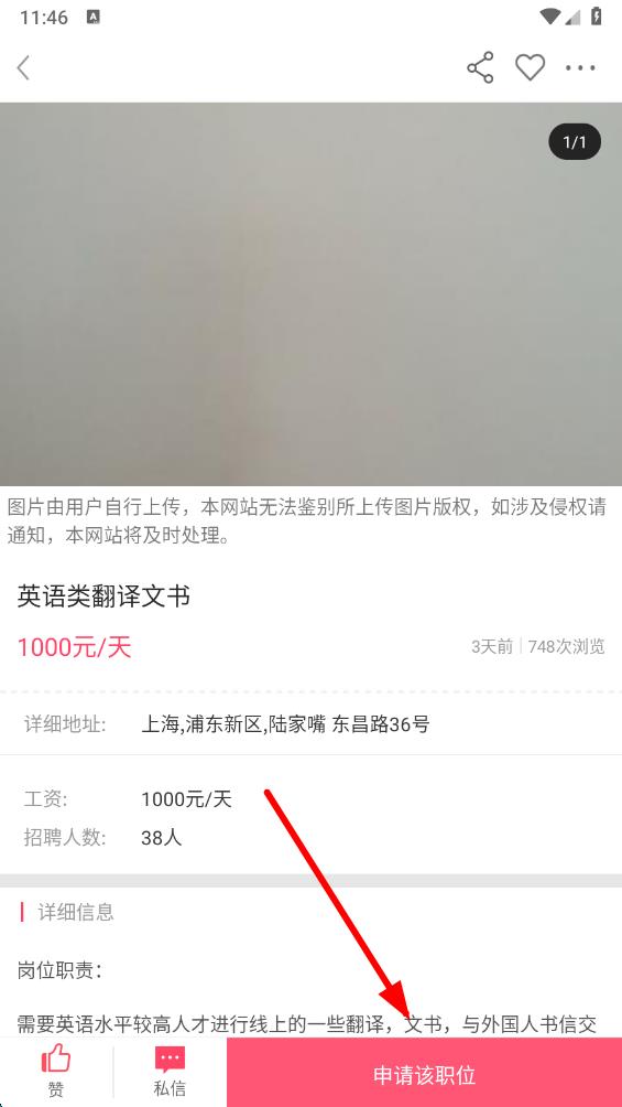 5、在詳情頁中查看崗位的詳細(xì)地址、工資、招聘人數(shù)等信息,確認(rèn)合適后,點(diǎn)擊申請(qǐng)?jiān)撀毼?,按照提示完成申?qǐng)操作。