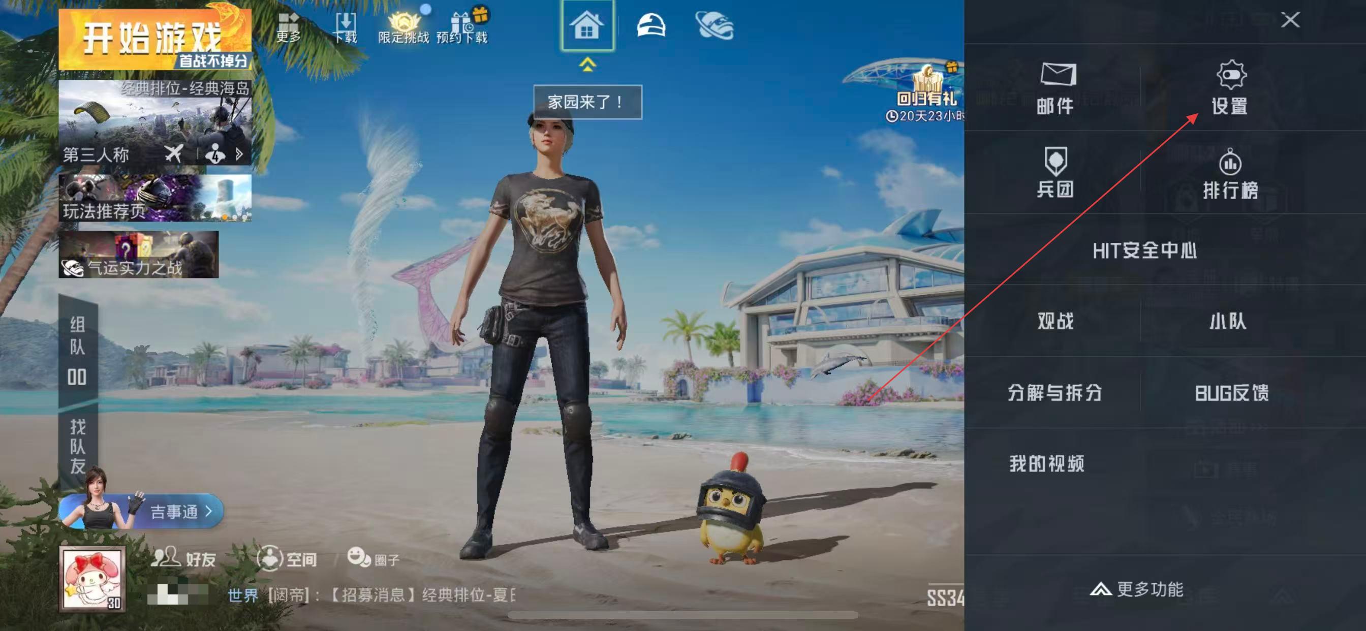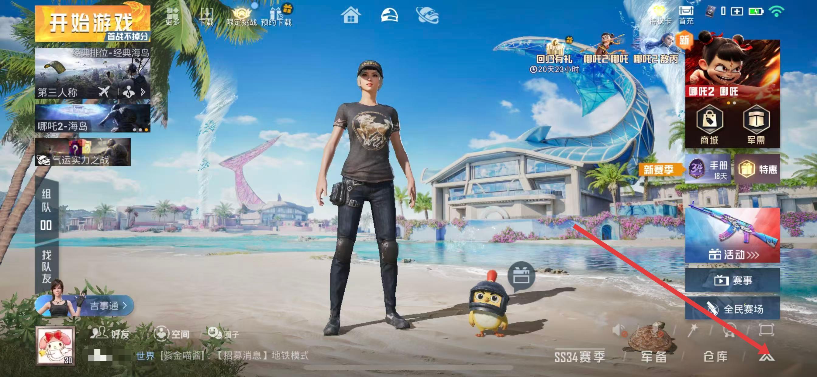 1、在和平精英游戲主界面,點擊右下角由兩個三角形組成的更多按鈕,展開更多功能選項。