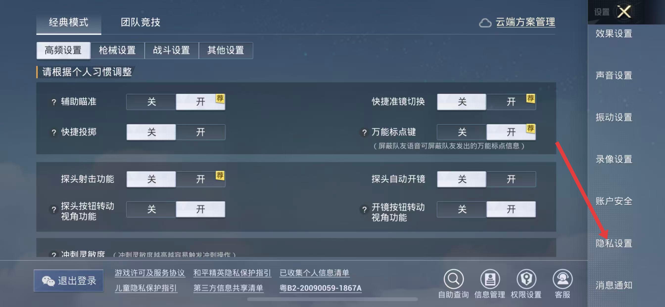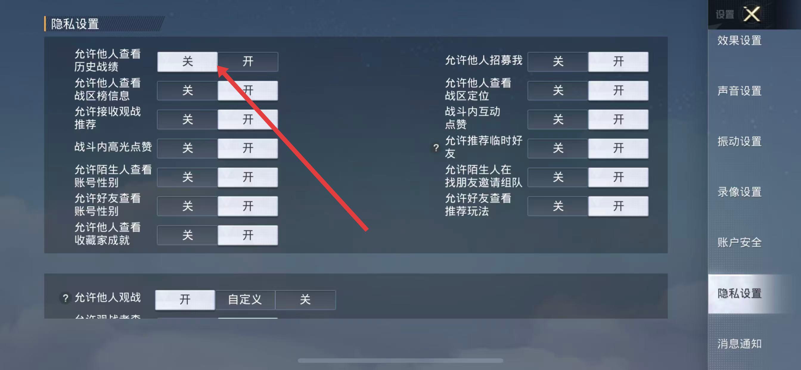 4、在隱私設置頁面,找到允許他人查看歷史戰(zhàn)績選項,點擊其對應的關(guān)按鈕,即可禁止別人查看個人戰(zhàn)績。