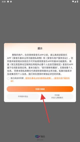 1、打開(kāi)愛(ài)音樂(lè)APP,一進(jìn)入會(huì)彈出提示,仔細(xì)閱讀后點(diǎn)擊同意并繼續(xù)。