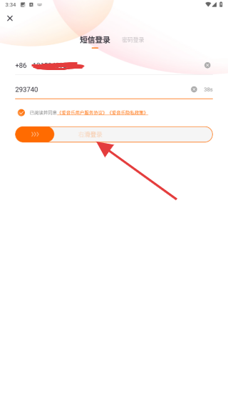 4、進(jìn)入到短信登錄的界面內(nèi),輸入手機(jī)號(hào)和驗(yàn)證碼后,再右滑進(jìn)行登錄即可。
