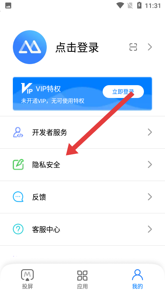 1、打開(kāi)傲軟投屏點(diǎn)擊底部導(dǎo)航欄的我的,進(jìn)入個(gè)人中心頁(yè)面,找到并點(diǎn)擊隱私安全選項(xiàng)。