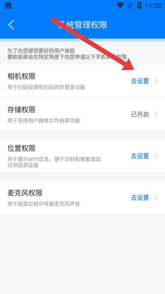 3、在系統(tǒng)管理權(quán)限頁(yè)面,找到相機(jī)權(quán)限選項(xiàng),點(diǎn)擊去設(shè)置按鈕,進(jìn)入應(yīng)用信息頁(yè)面。