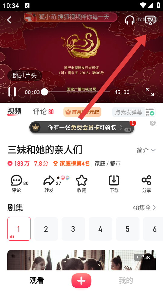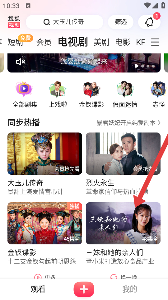 1、打開搜狐視頻APP,在觀看頁面找到想要投屏的電視劇,點擊進入該劇的播放頁面。