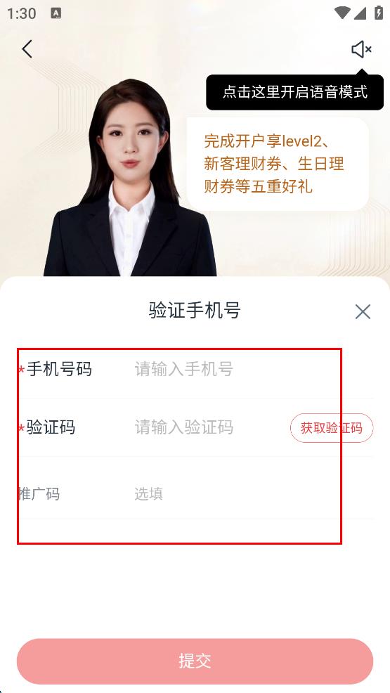 4、在驗證手機號頁面輸入手機號碼,點擊獲取驗證碼,收到后輸入驗證碼,如有推廣碼可填寫,最后點擊提交按鈕。