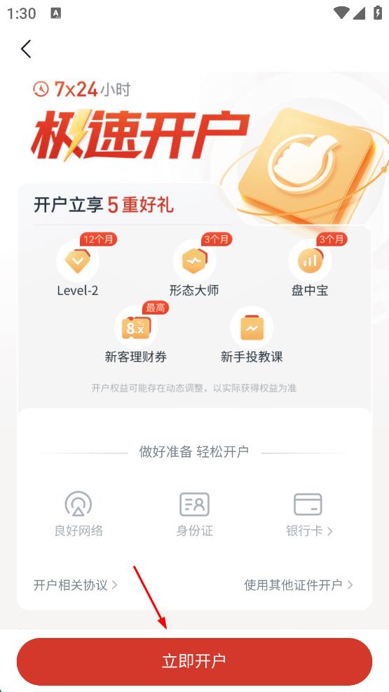 3、在極速開戶頁面點擊立即開戶按鈕,進入驗證手機號頁面。