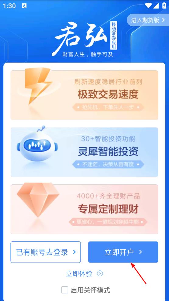 2、進入君弘移動證券應用頁面,點擊立即開戶選項,進入極速開戶頁面。