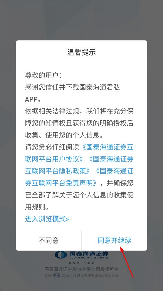 1、打開國泰海通君弘App,出現(xiàn)溫馨提示彈窗,閱讀后點擊同意并繼續(xù)按鈕。