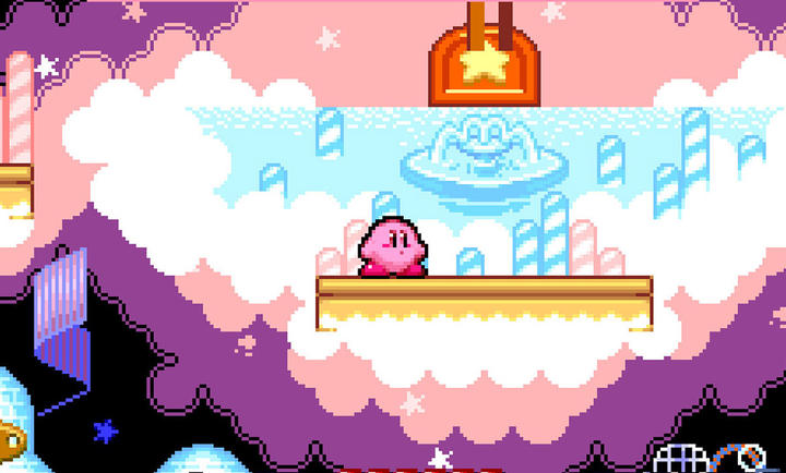 A鍵為跳,再按一下就會(huì)含一口氣在肚子里,可以飛起來(lái)。從高處(2/3個(gè)屏幕高)掉下來(lái),就會(huì)大頭朝下落,這樣也是有攻擊力的。在肚子鼓起來(lái)的時(shí)候按B鍵是吐氣,有攻擊力的,攻擊距離很短。在肚子空的時(shí)候按B鍵是吸氣,可以吞掉敵人,就算是有墻隔著的地方也可以吸到。如果是吸到有特殊能力的敵人,按一下十字鍵的下鍵就可以復(fù)制敵人的能力。吸入兩個(gè)敵人再按下鍵,就可以用輪盤(pán)選擇能力,等它自動(dòng)停下來(lái)的話,是大錘能力;吸入兩個(gè)敵人后噴出,噴出的星星有穿透效果。(如果將星星和敵人同時(shí)吸入再使用,則使用星星的能力)如果蹲著按B鍵可以做出滑鏟的動(dòng)作。