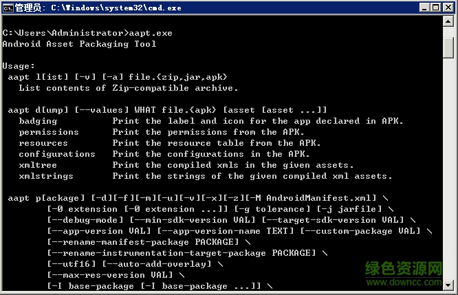 測(cè)試安裝方法:命令行下運(yùn)行aapt.exe