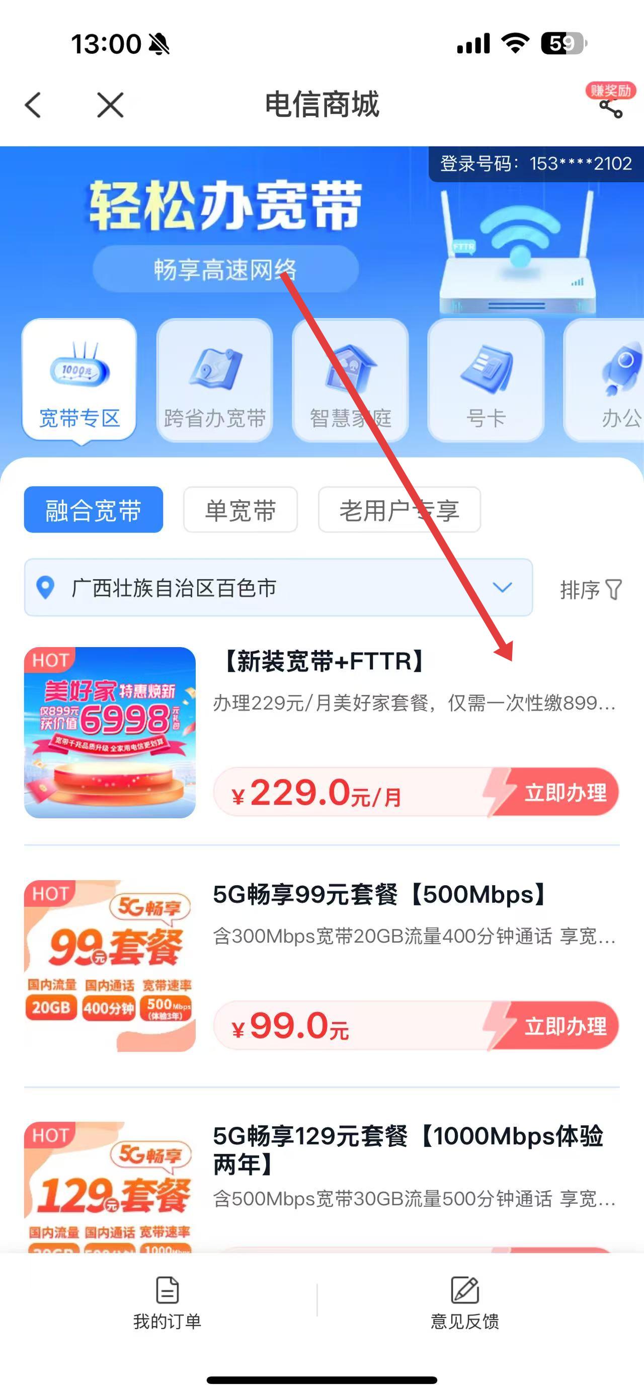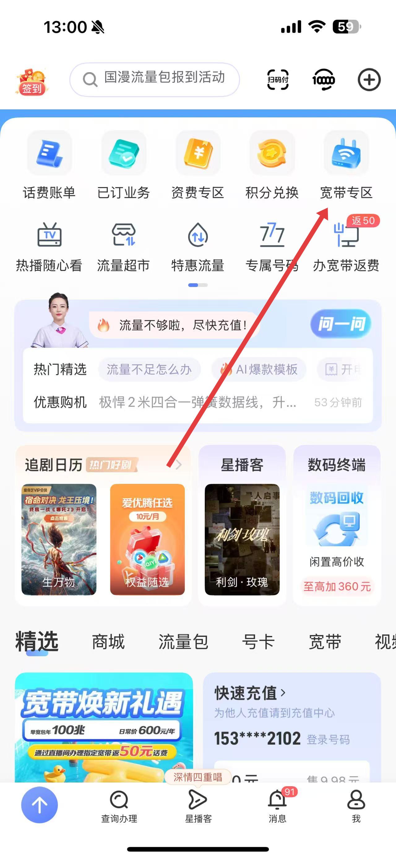 1、打開中國電信APP,進入首頁,點擊上方功能區(qū)的寬帶專區(qū),進入電信商城的寬帶辦理界面。