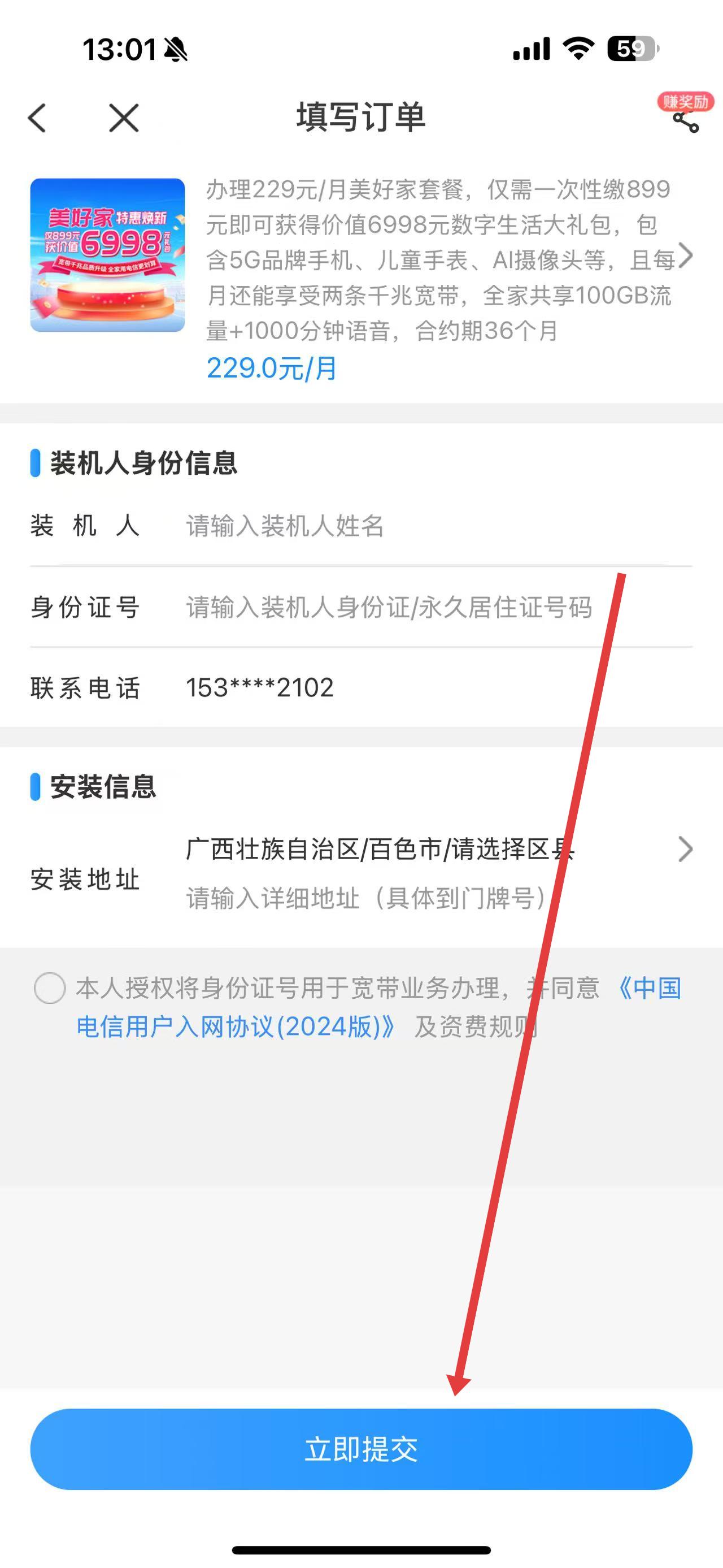 3、進入填寫訂單頁面,按要求填寫裝機人身份信息姓名、身份證號等和安裝信息安裝地址,確認信息無誤后,點擊立即提交,等待電信工作人員聯(lián)系并上門安裝。