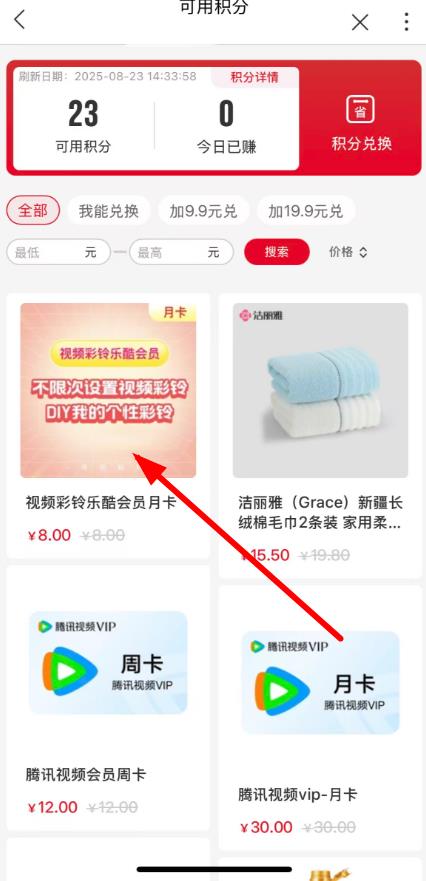 3、進(jìn)入可用積分頁面后,瀏覽可兌換商品,點(diǎn)擊想要兌換的商品,如視頻彩鈴樂酷會員月卡,按提示完成兌換操作。